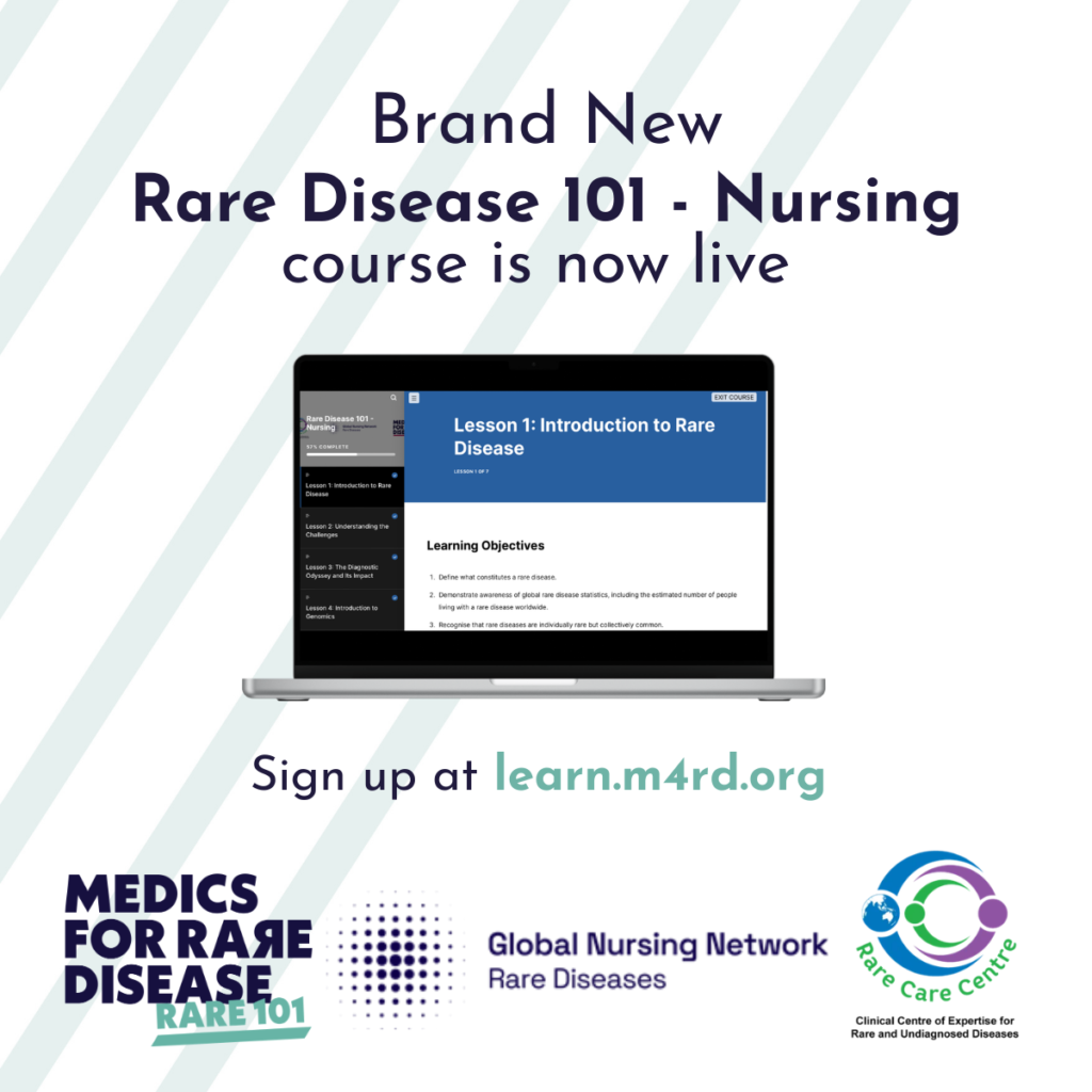 Rare Disease 101 (Nursing) is now available free of charge through the Medics for Rare Disease’s learning platform: https://learn.m4rd.org/