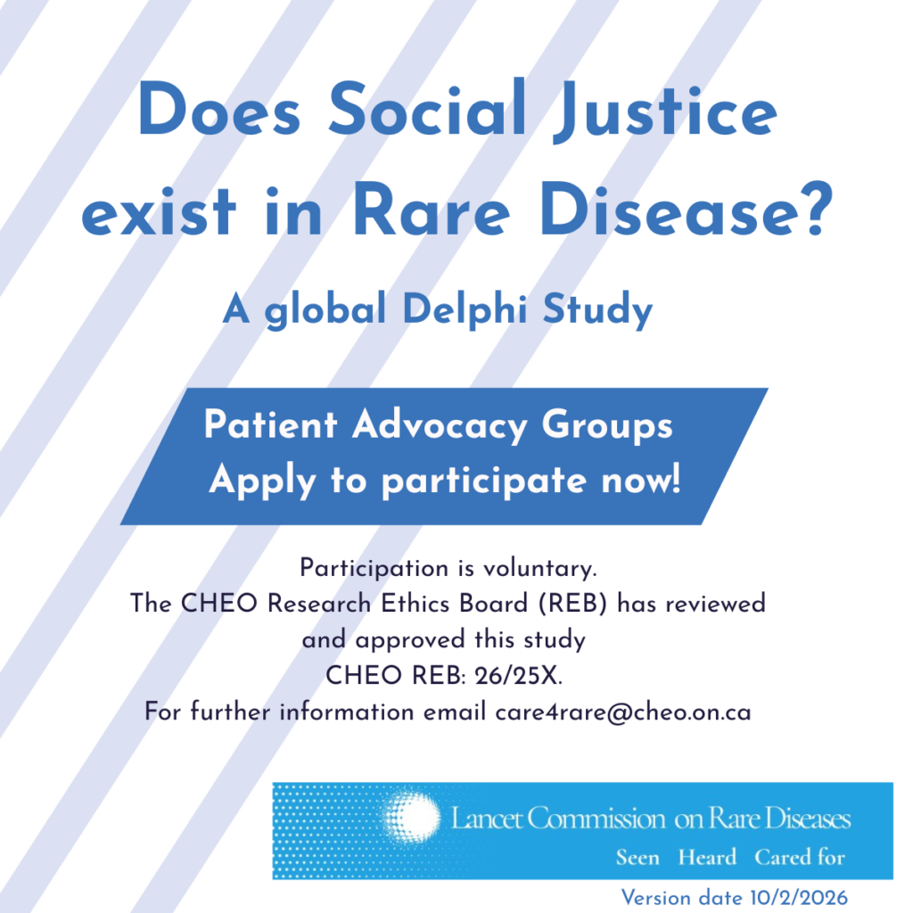 We are collaborating with the Children’s Hospital of Eastern Ontario (CHEO) to conduct a global moderated Delphi study to build consensus and hear from all Rare Communities on their lived experiences in relation to social justice.